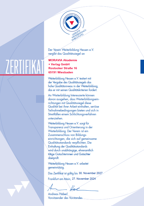 Darüber hinaus ist die MORAVIA Akademie + Verlag auch Mitglied im Bundesverband betriebliche Weiterbildung. Für die Weiterbildungsunternehmen der Wirtschaft ist die Mitgliedschaft im Bundesverband betrieblicher Weiterbildung ("Wuppertaler Kreis"), ein bedeutendes Qualitätsmerkmal. Die Grundsätze zur Sicherung der Qualität in der Weiterbildung des Wuppertaler Kreises und das an der Qualität der Angebote ausgerichtete Aufnahmeverfahren für neue Mitglieder dokumentieren diesen gemeinsamen hohen Qualitätsstandard. Im Verband sind 50 der renommiertesten Bildungsunternehmen in Deutschland vertreten. Wir sind stolz, nach dem bestandenen Aufnahmeverfahren das Qualitätssigel „Qualität in der Weiterbildung - Wuppertaler Kreis e.V.“ tragen zu dürfen. Erfahren Sie mehr über den Verband und sein Qualitätssiegel auf der Website.